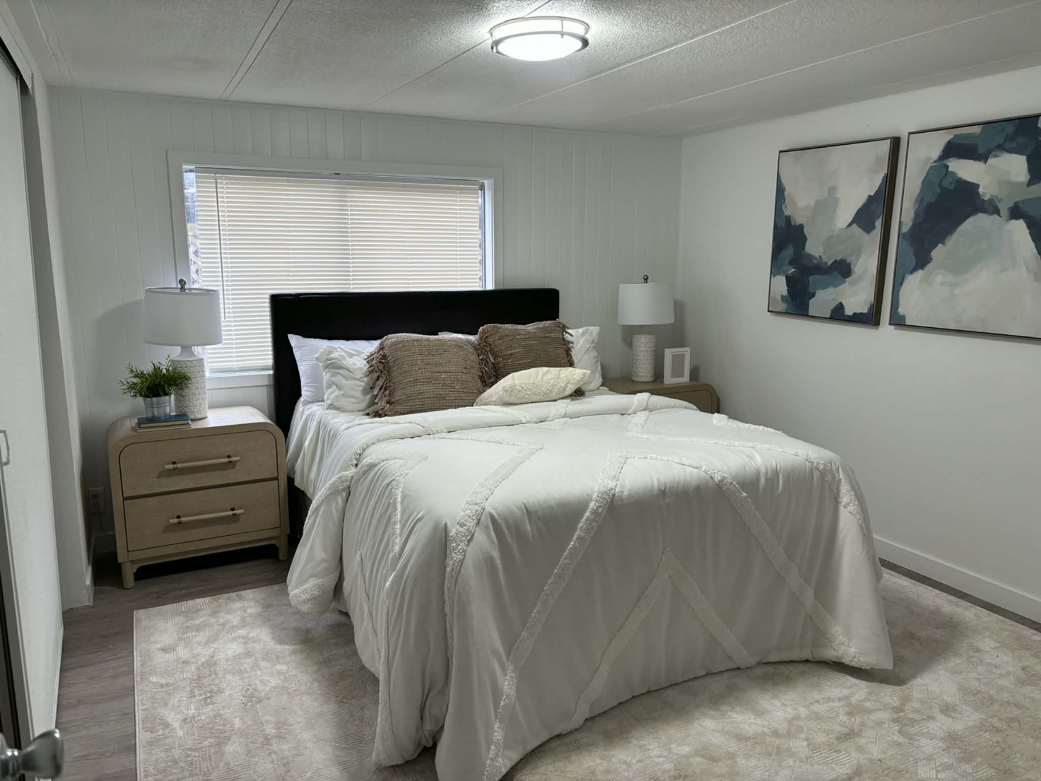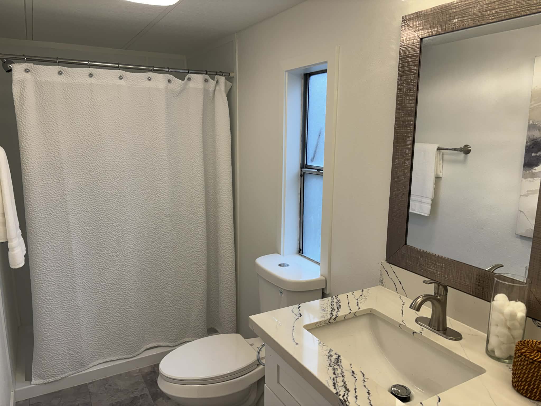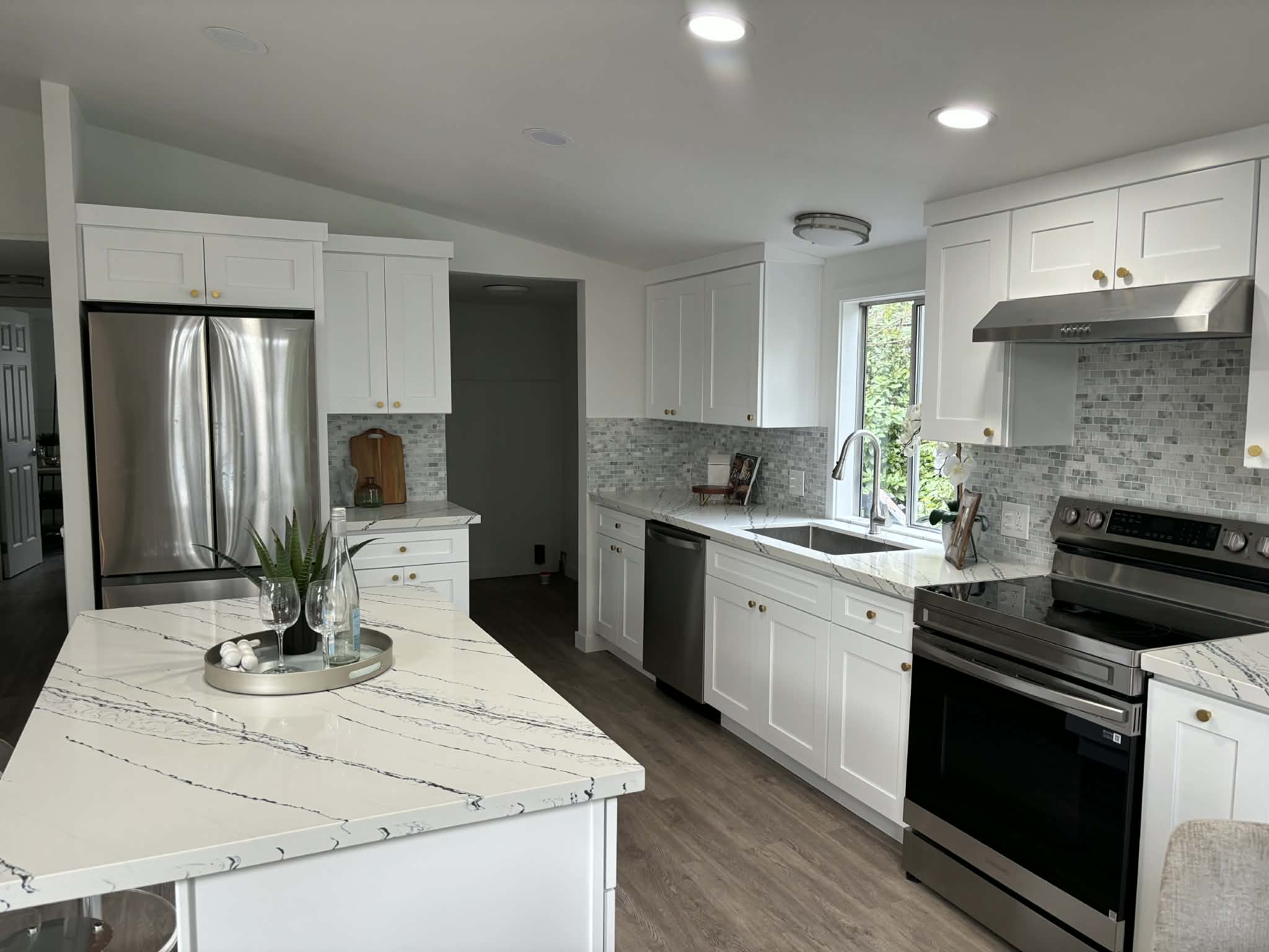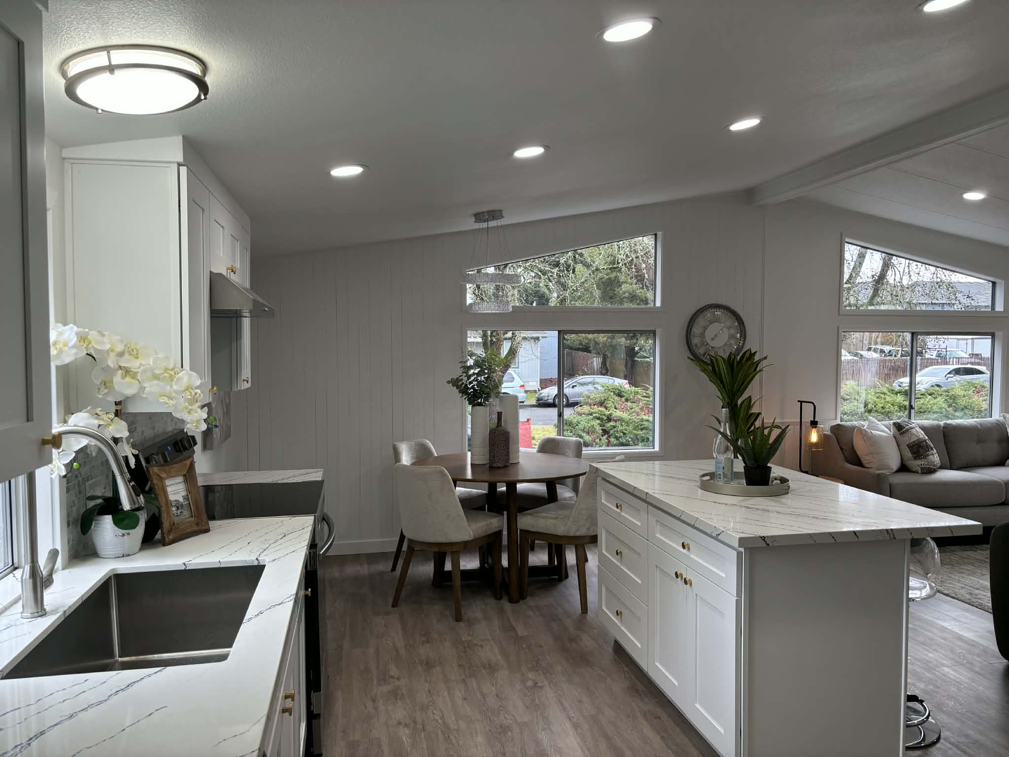 Enjoy peace of mind with a new roof, new siding, and new decks, then step inside to an elegant interior featuring new laminate flooring, new walls, and a beautifully updated kitchen. The kitchen and bathrooms showcase matching cabinetry, with the kitchen offering soft-close English-style cabinets for a refined, modern feel.